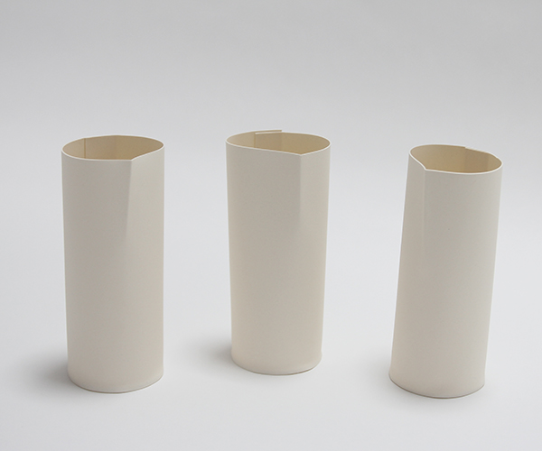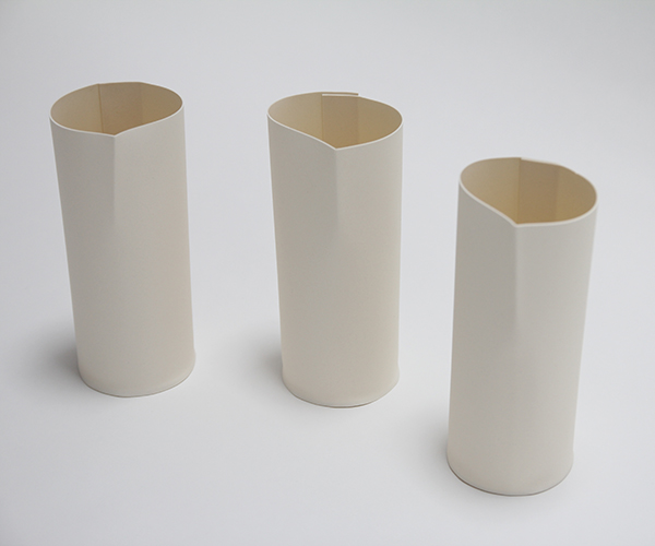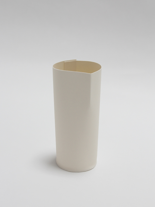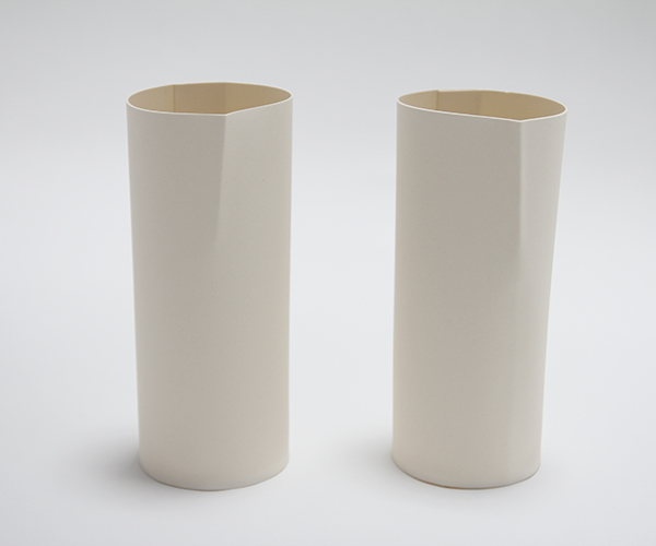 How support and transcend these qualities to give it resistance and hardness, maintaining lightness and purity ? It's the use of « porcelain paper ». Mold, the structure appear to 1280°c. The sheet crystalized, the object stabilised. No restrictions, no specified rhythms. Flexibility of mold create the lightness of the product ! The body is revealed, the object completed.