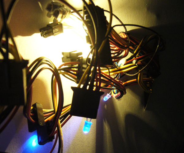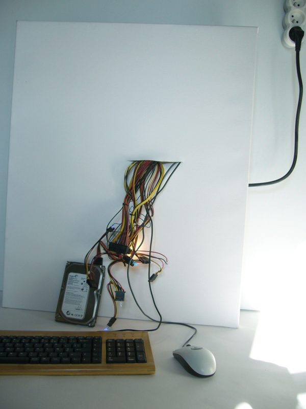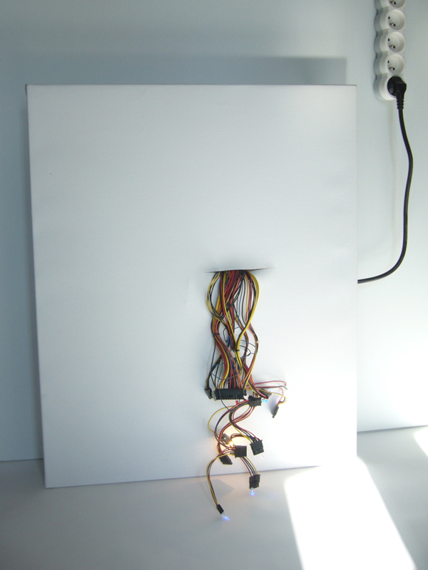 Une toile percée blanche, sur un mûr blanc. Aucune aspérité. Juste cette incision chirurgicale, à peine visible, d’où jaillissent des entrailles scintillantes. Du souffle continuel de la ventilation se dégage une impression dynamique, organo-technique. La toile semble envelopper un corps. Derrière cette peau tendue, cette membrane on semble presque distinguer, une batterie, un processeur, un cœur. Oscillation provoquée entre substance inerte et processus dynamique, entre objet figé et combinaisons energético-électrique.