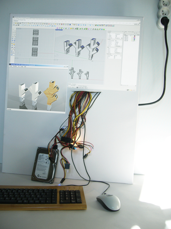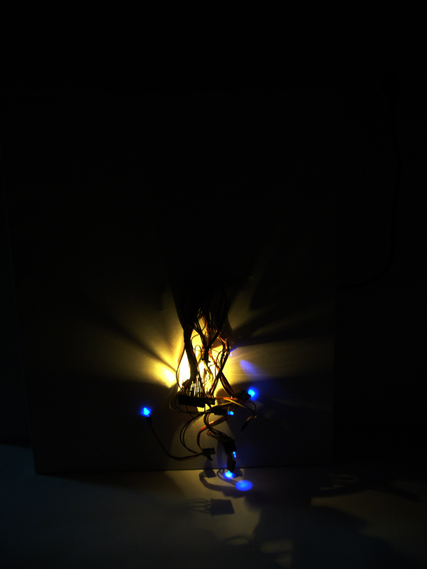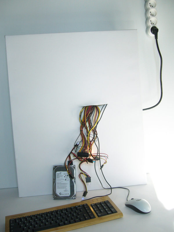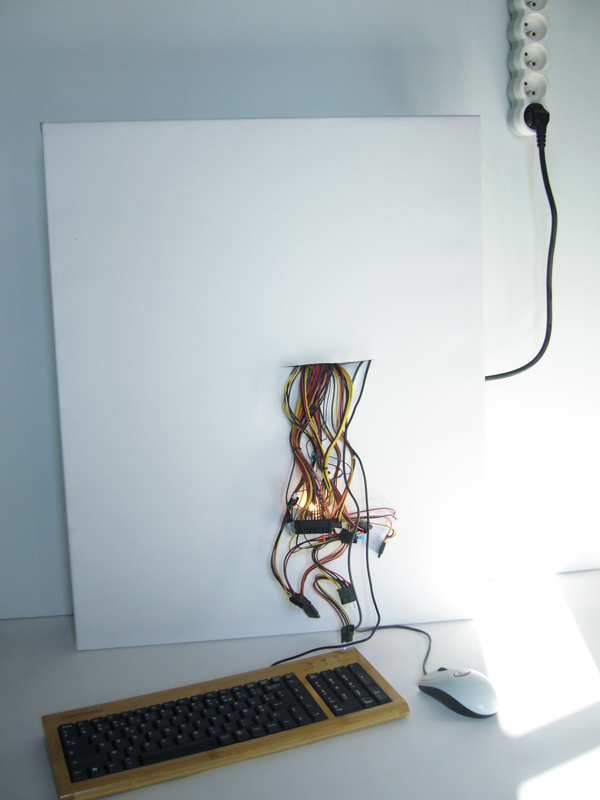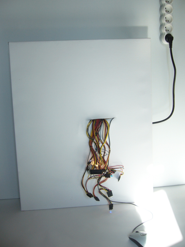 De l’intérieur naît le sens. Une forme, un modelage, une toile blanche qui n’en est plus une. Qui quitte le cadre de bois. La toile tendue immaculée, devient corps électrique. L’affecte poétique de l’objet artistique fait place à la matérialité et à l’imaginaire électrotechnique. Il y a modification de substance perceptive. Le regard et la pensée sont happés par les fils de cette réalité. Virtuelle, notre imagination est piégée, détournée, et nous sommes l’objet de ce détournement. Notre désir frénétique de réalité, cette envie prenante de se raccrocher de se reconnecter, de panser au lieu de penser. Dans un mouvement d’expansion organique, nous greffons les organes de la vue, du toucher. Le dessin de l’œuvre mue alors vers le dessein actif et réactif du produit inséré et dynamique. A fleur de toile ! on s’écrit …